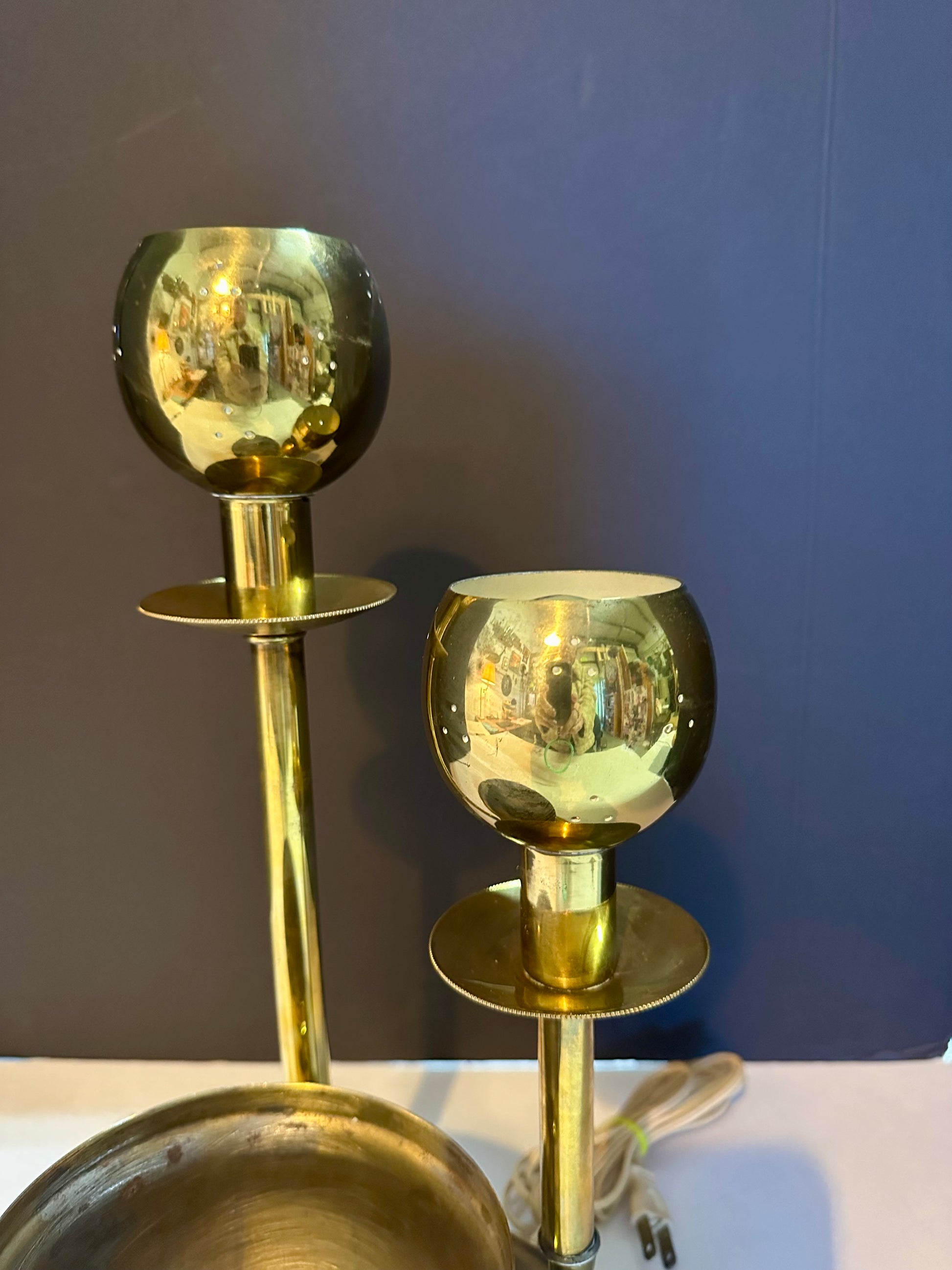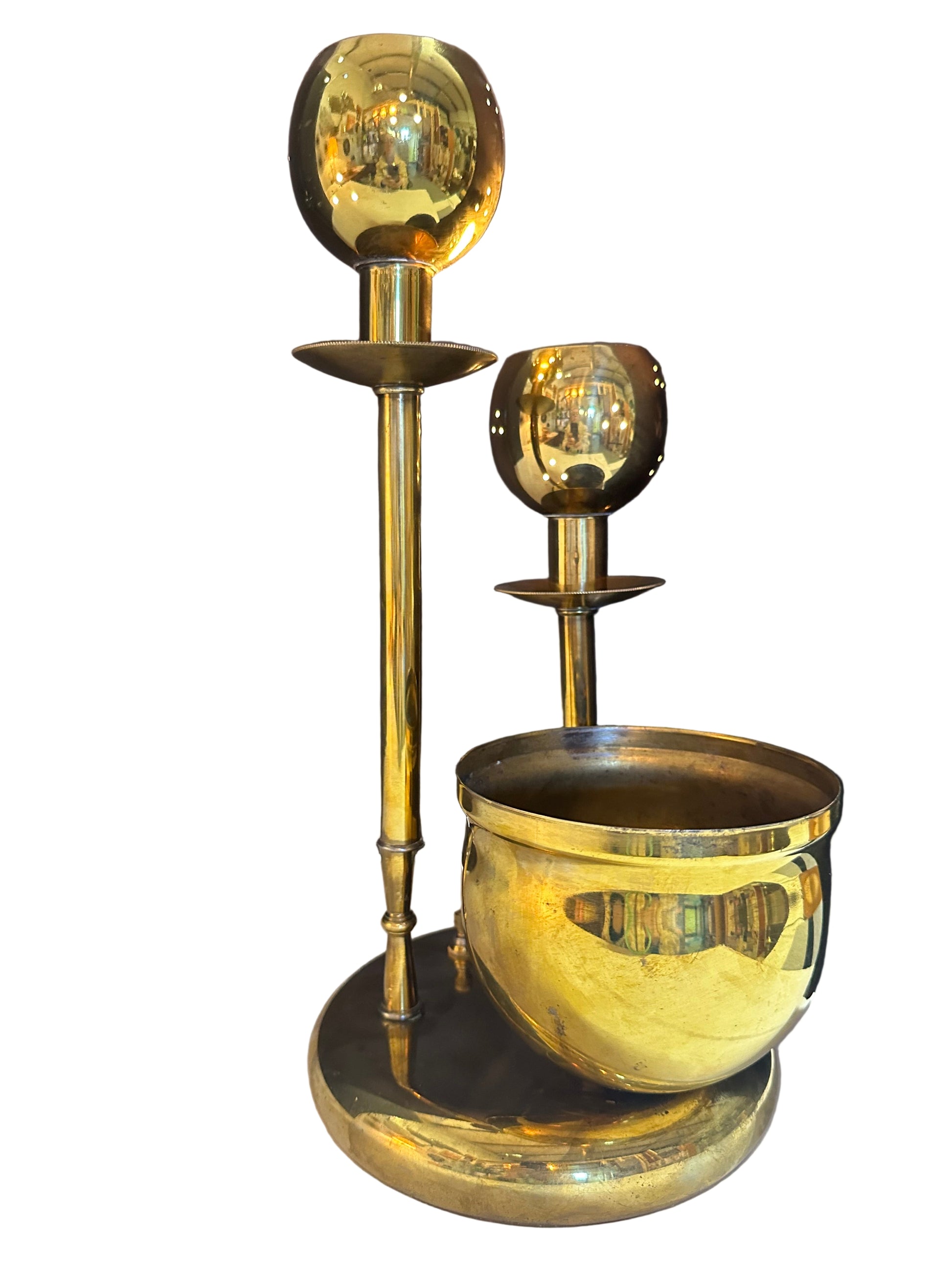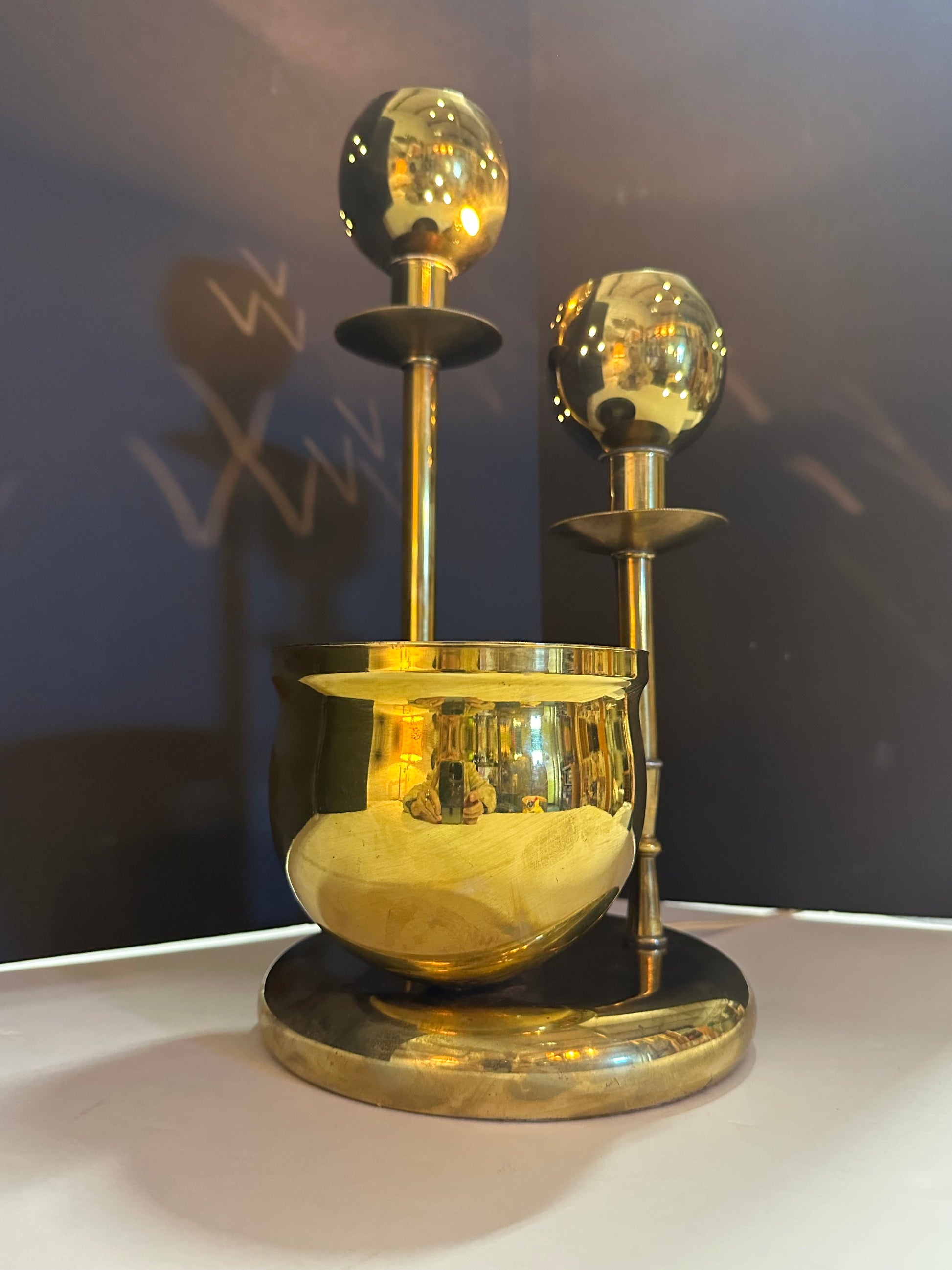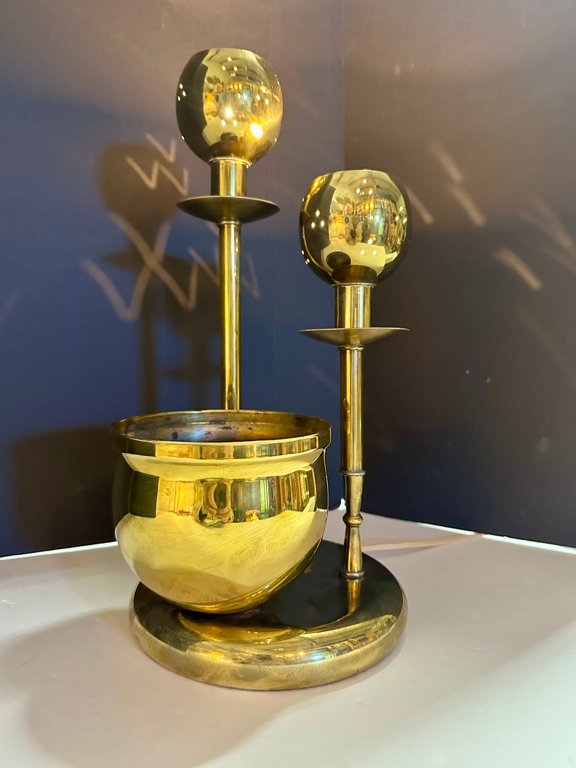 Mid century era accent lamp with two perforated round brass candelstick lights and an attached brass planter bowl.