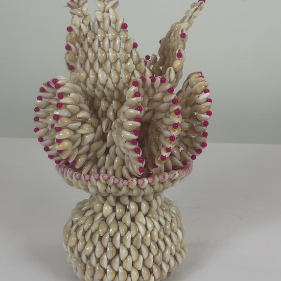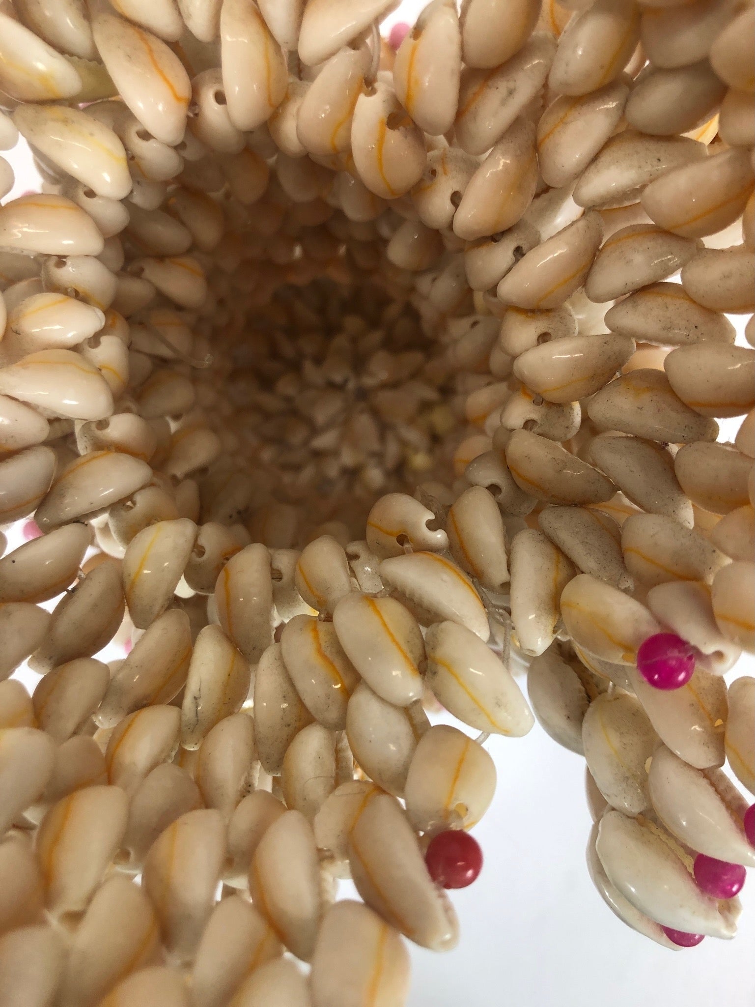 Vintage handmade vase using natural cowrie shells and beads. 1970s polynesian art.