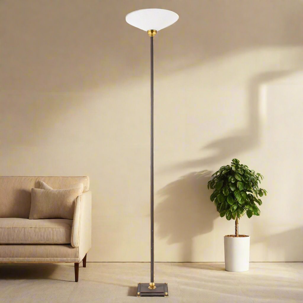 Extra tall, narrow minimalist vintage torchiere floor lamp of cast iron with a deep burgundy finish and a spotted frosted glass torchiere shade. Solid brass detailing and feet. Operates with an on/off switch on the cord.