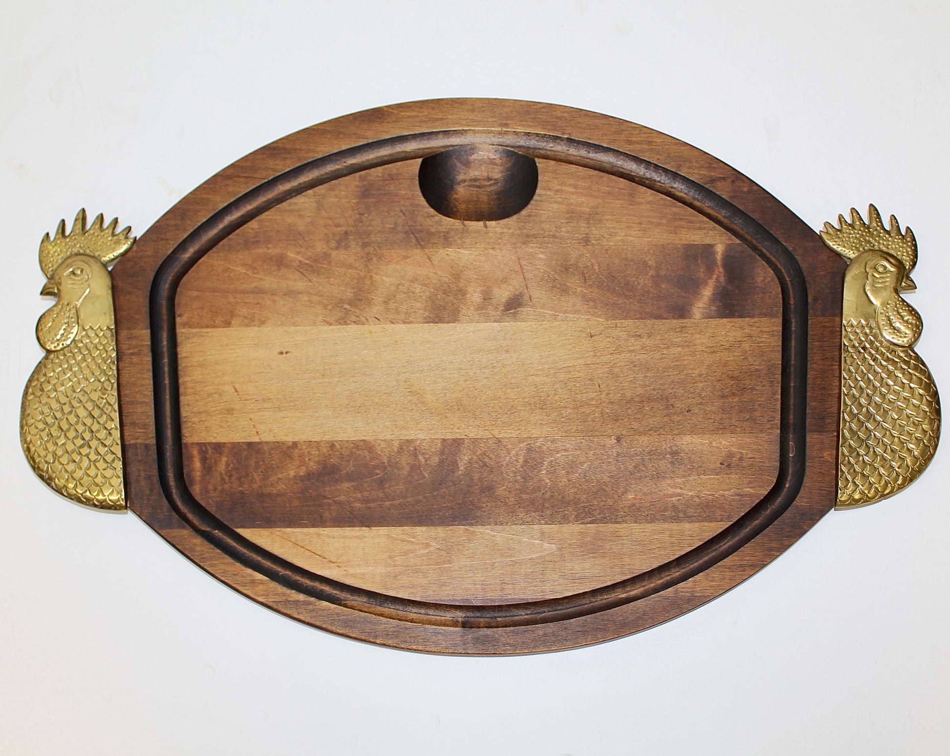 Large Vintage Wooden Cutting Board Serving Tray with Brass Roosters