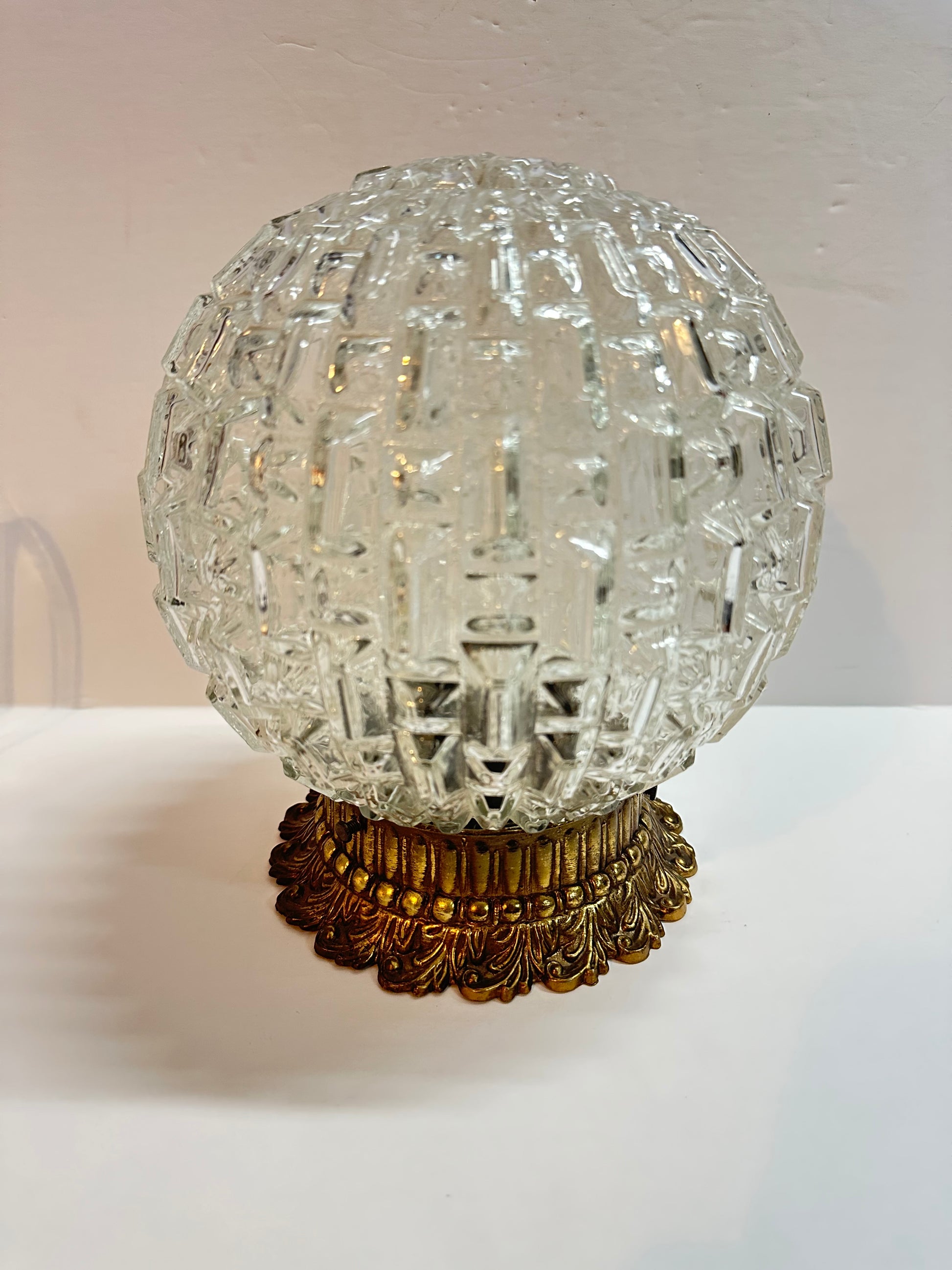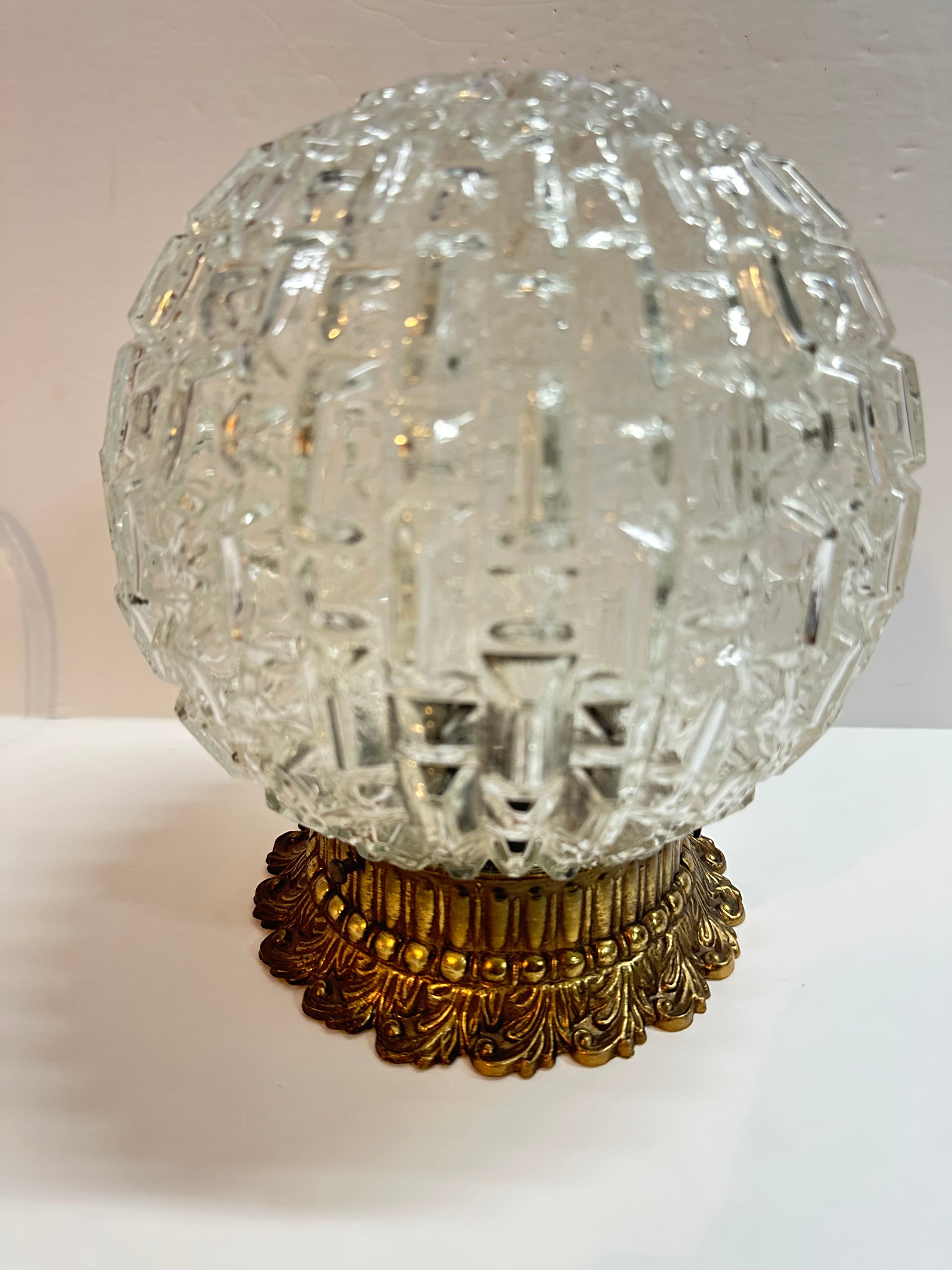 Round glass globe with faceted glass on an ornate brass one-light fixture. Requires hardwired installation
